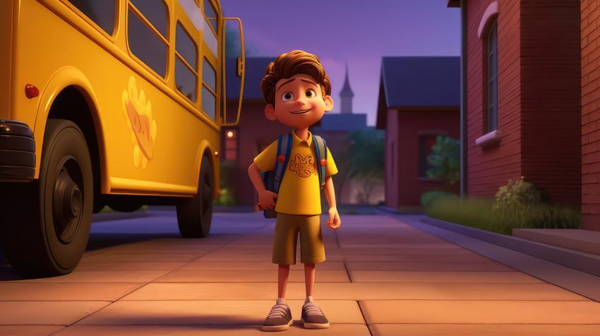 back to school theme, photo of a kid will enter to school bus 3d cartoon character