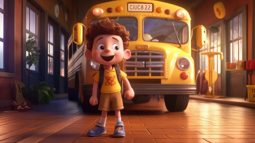 back to school theme, photo of a kid will enter to school bus 3d cartoon character