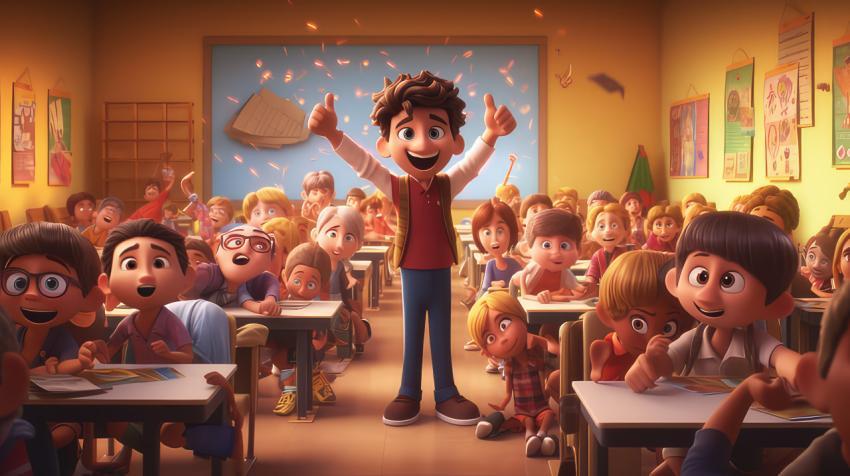 Back to school theme picture, photo of students and teacher in the classroom very happy