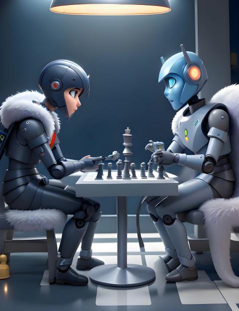 3D Animation Style A futuristic robot plays chess with his mg