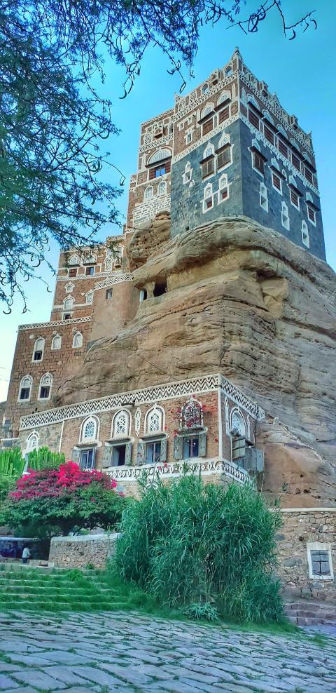 The image is a historical photo of an ancient heritage building in Yemen called Dar Al-Hajar. The heritage palace is located in Sana'a, Yemen, and was once inhabited by a ruler of the country in the past.