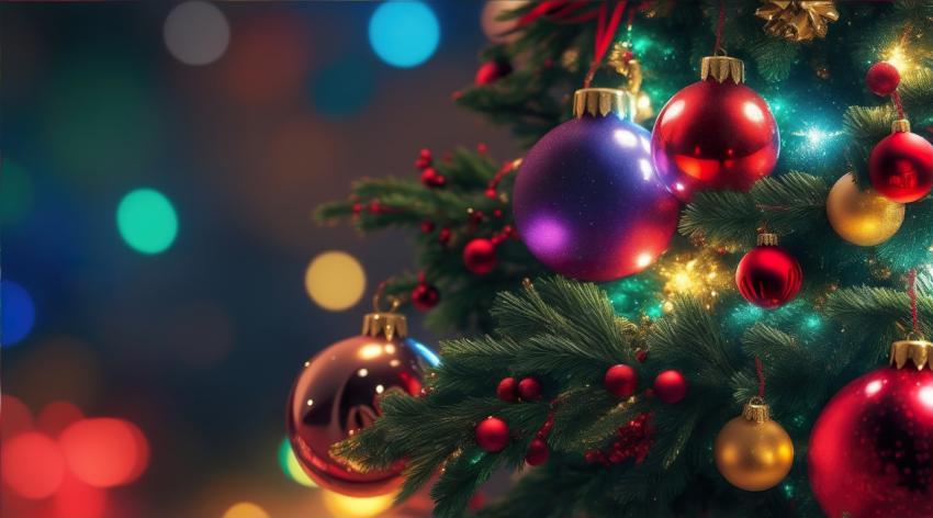 Embark on a festive journey through our captivating illustration, showcasing a resplendent Christmas tree adorned with exquisite, brightly colored ornaments. The background features a delightful blur of twinkling lights, adding to the enchantment of the holiday season and conveying the joy and splendor of this magical time.