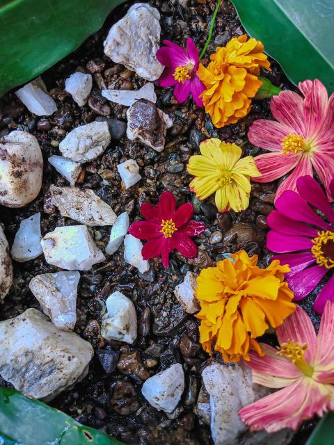 stone and colorful flowers