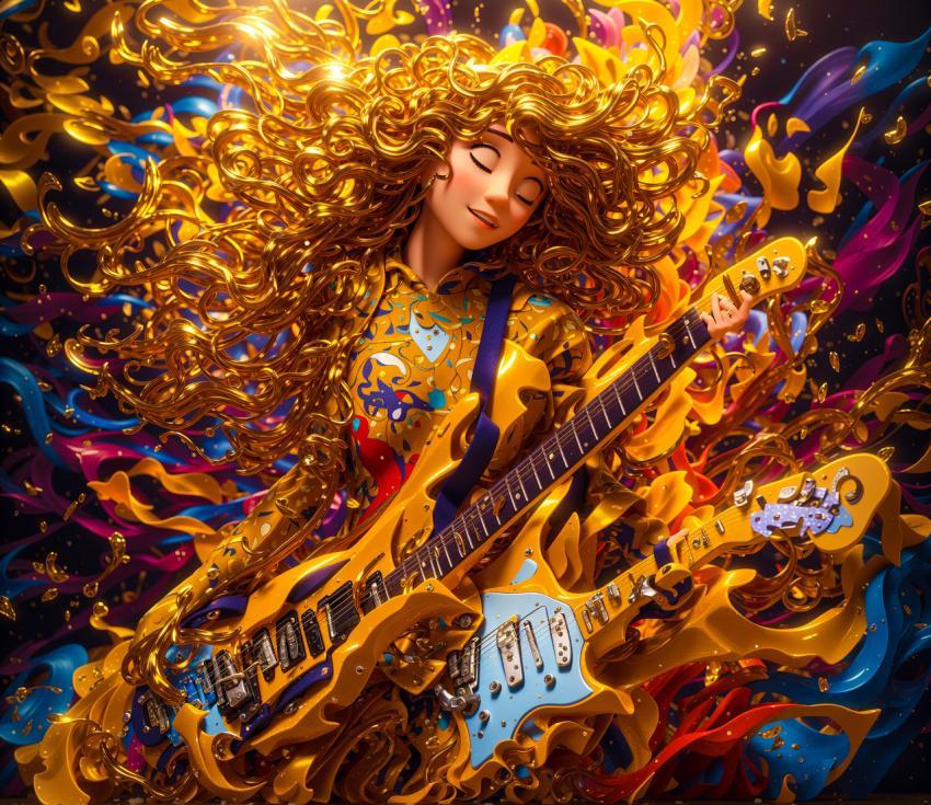 Explore 'Gilded Harmony,' a captivating realm where musical expression blends with abstraction. This striking picture reveals a range of vibrant hues, complemented by a smooth blending of golden waves that elegantly curve the body of a finely detailed guitar. The spectator is drawn into the minute details of every string and fret thanks to the depth of field, which produces an immersive experience. Sparkling splashes give a magical touch and evoke the dynamic energy of a momentarily frozen musical performance. "Gilded Harmony" is a visual symphony that transforms the essence of music into a vivid and captivating piece of art.
