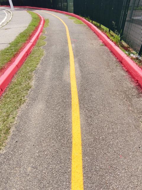 Deserted asphalt cycle path. Demarcated in red and yellow with a curve in perspective on a sunny day.