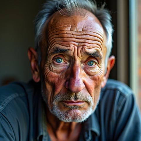 portrait man middleaged weathered wrinkles blue eyes natural light window closeup dslr 85mm lens shallow depth of field experience wisdom face skin detail professional headshot character storytelling mature masculine emotional contemplative intense eye contact human interest age life time personality expression candid genuine authentic realistic photographic high resolution bokeh studio model dramatic moody atmospheric serious pensive introspectiveSimilar Photos