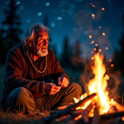 indigenous elder storytelling campfire tradition wisdom culture heritage oral history firelight stars night sky portrait wrinkles experience fullframe camera wideangle lens lowlight photography outdoors nature wilderness tribal native ancestry generations legacy knowledge spiritual connection community folklore myths legends ceremony ritual elder wisdom ancestral cultural preservation nighttime atmospheric moody rustic authentic environmental portrait ethnography anthropology documentary human interestSimilar Photos