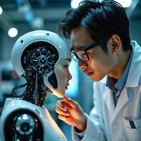 This captivating image offers a glimpse into the future of robotics and AI. A skilled young engineer delicately works on a remarkably human-like android, blurring the lines between man and machine. The photograph beautifully illustrates the intricate fusion of technology and humanity, showcasing the artistry and precision involved in creating artificial life.