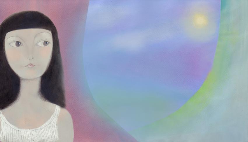 illustration in watercolor, crayons and collage of a female portrait in nature