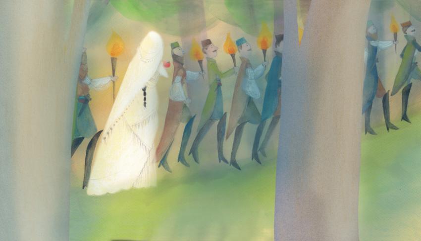 illustration in watercolor, crayons and collage of Slavic ethnic ceremony