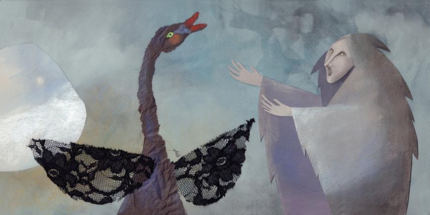 illustration in watercolor, crayons and lace collage of the black swan and the witch