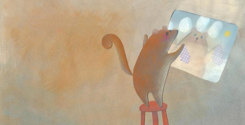 illustration in watercolor, crayons and collage of the dormouse cleaning a window