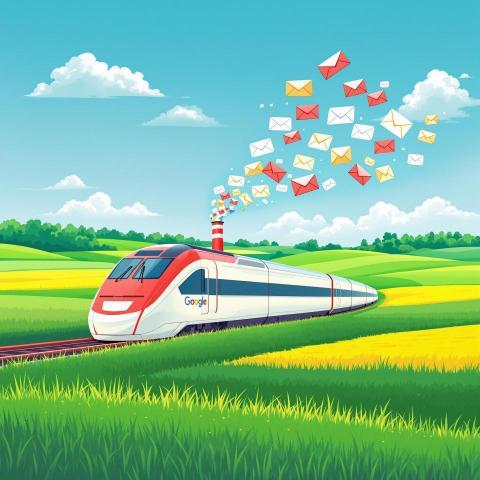 A high-speed train racing through the countryside, with colorful envelopes flying out of its chimney like smoke, symbolizing Gmail's speed and efficiency.
