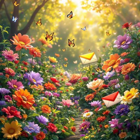 A magical garden where flowers bloom into colorful envelopes, symbolizing Gmail messages flourishing in creativity and connection.