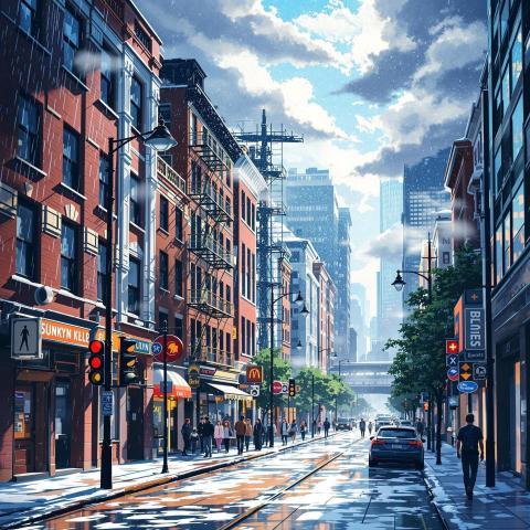 A bustling city where every street corner has its own weather—rain on one, sunshine on another, snow in a third.