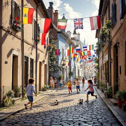 euro 2025 street football european village kids playing football photorealistic sports scene euro 2025 inspiration cobblestone street realistic village sports football passion european tournament community football joyful kids eurothemed village grassroots football realistic sports scene football traditions euro 2025 creativity village celebration kids and football nostalgic sports momentsSimilar Photos