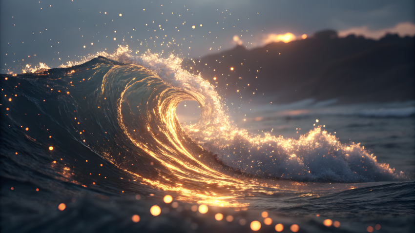 This breathtaking digital artwork captures a glowing ocean wave illuminated by the soft light of a sunset. The crest of the wave is laced with sparkling bioluminescent particles that glimmer in shades of gold, pink, and turquoise. A dreamy blend of vibrant color and motion, the scene evokes tranquility and wonder, making it ideal for themes of nature, fantasy, peace, and the sublime power of the sea. With a cinematic depth of field and surreal lighting effects, this image is perfect for use in creative projects, album covers, travel blogs, calming apps, wallpapers, and inspirational visuals.