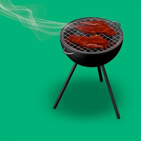 Grill with a smoke on a green background with two juicy steaks. 3D illustration, 3D rendering