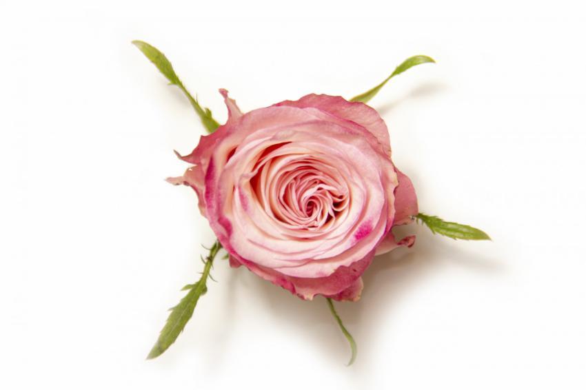 Close-up of a vibrant raspberry cream rose bud on a white background